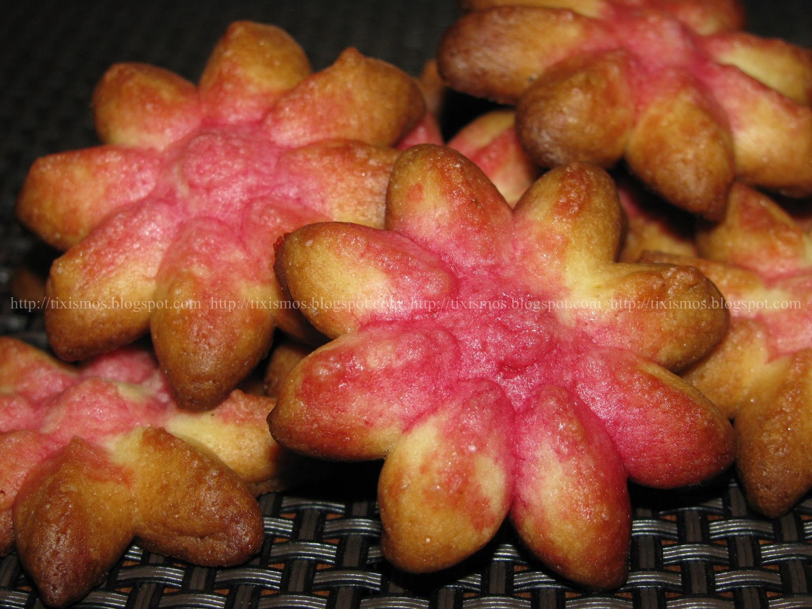 Fiz novamente umas rosetas, desta vez peguei na receita das rosetas de limão colocada aqui e pincelei com groselha e ficaram bem girinhas.