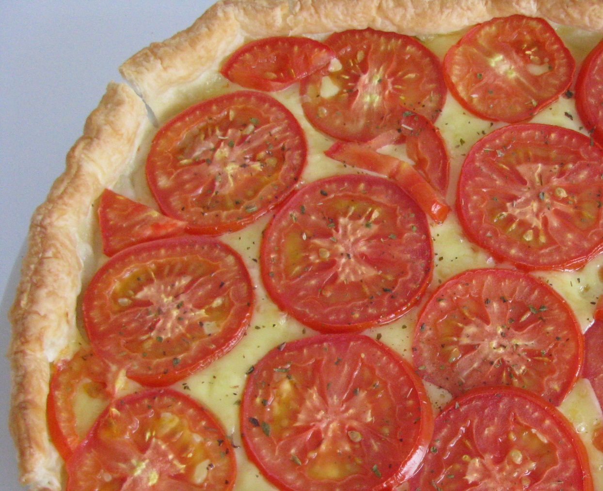 Misture toda a lista de ingredientes numa tigela, excepto o tomate. Verta para a tarteira.