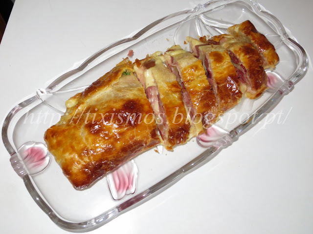 Espalhar a massa folhada, preencher com o queijo, fiambre, o bacon e outra vez queijo.