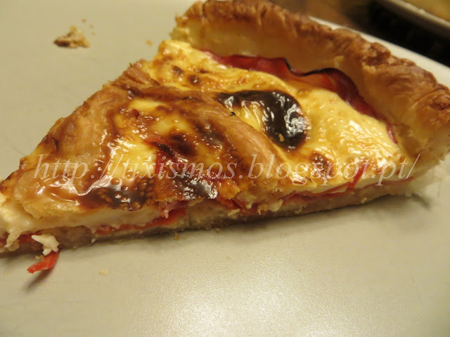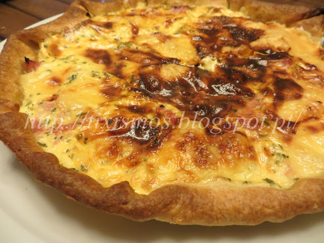 Espalhar a massa numa tarteira, cobrir com o fiambre e queijo aos pedaços, por cima espalhar a taça anterior.